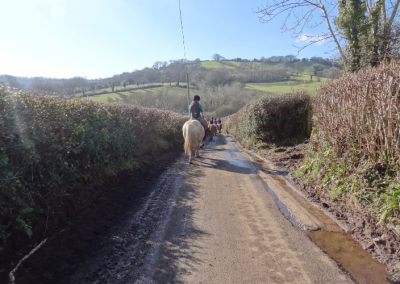 Walk straight along Colyton Road for 1 mile, past Road Pitt Farm (on the map) use the bridge over the stream, take the next right (S) in through a kissing gate into a field (SY216 953) and join the riverside path.